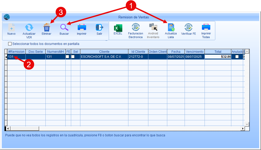 Actualizar Lista para que se muestren todas las remisión elaboradas durante el día (fecha actual). O en caso que el pedido sea de otra fecha haga clic en el botón Buscar y realice el proceso de Buscar una remisión de ventas.
