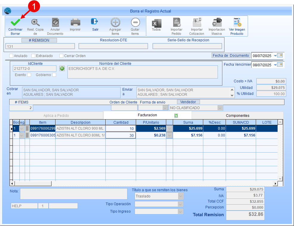 Eliminar. Si el documento no tiene pagos o abonos registrados, se abrirá la ventana Borra el Registro Actual.